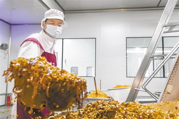 6月11日,广西柳州市一家螺蛳粉生产企业的工作人员为袋装螺蛳粉生产线补充配料。