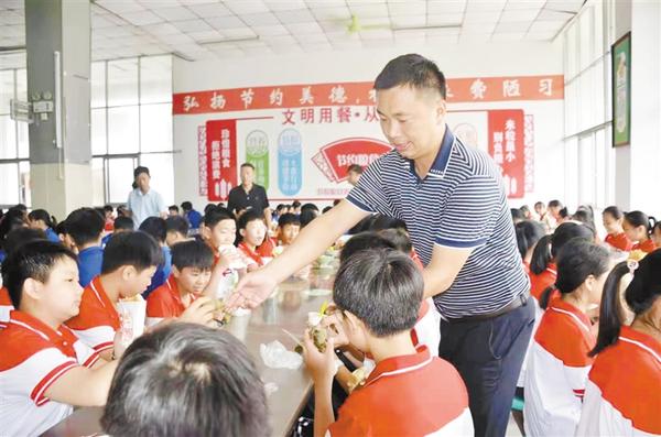 6月14日,郸城县第二实验中学朱玉良、李继元等校领导在餐厅和学生一起过端午节。