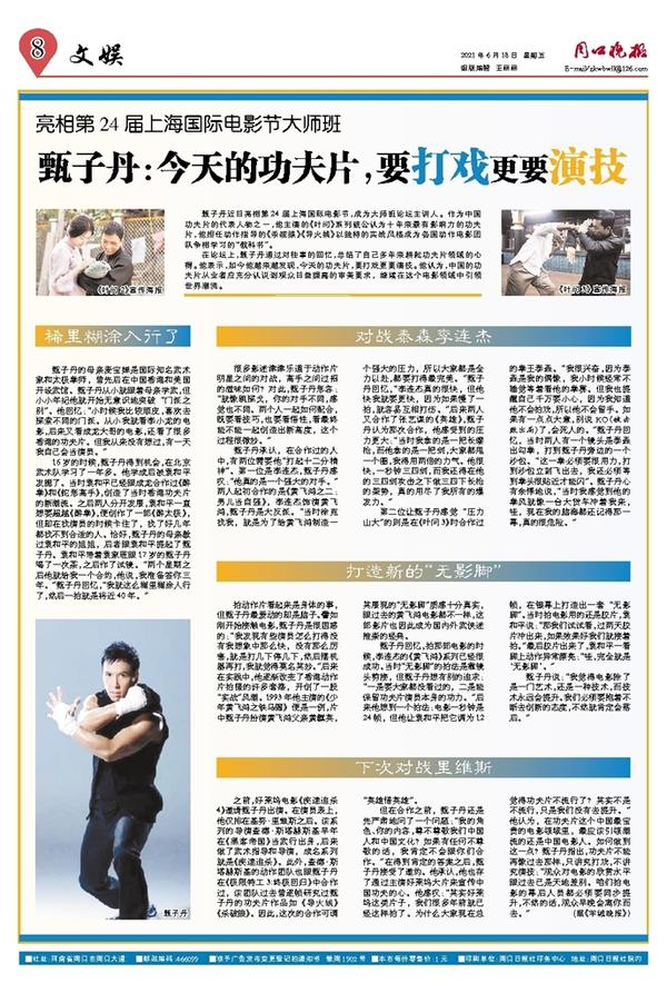 很多影迷津津乐道于动作片明星之间的对战,高手之间过招的滋味如何?对此,甄子丹形容:“就像跳探戈,你的对手不同,感觉也不同。两个人一起如何配合,既要看技巧,也要看悟性,看最终能不能一起创造出新高度,这个过程很微妙。”