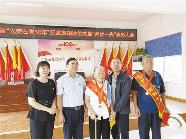 本报讯 五十载初心不改,五十载一心向党。6月26日,郸城县洺南街道举行“光荣在党50年”纪念章颁发仪式,活动现场,一位白发苍苍的老人在儿子的搀扶下来参加仪式。大家没想到,她的儿子也是来领纪念章的,母子共同荣膺这份无尚荣耀。