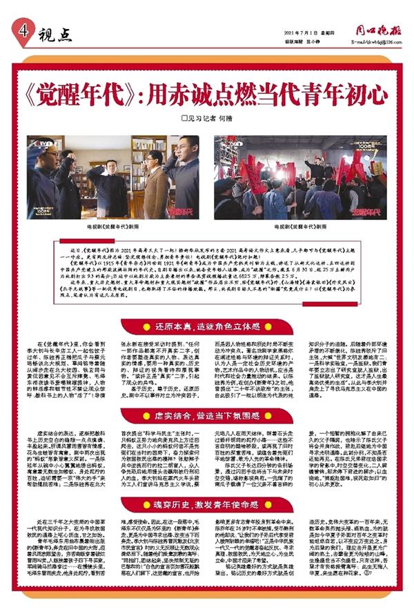 《觉醒年代》以1915年《青年杂志》问世到1921年《新青年》成为中国共产党机关刊物为主线,讲述了从新文化运动、五四运动到中国共产党建立的那段波澜壮阔的年代史。自剧目播出以来,就备受年轻人追捧,成为“破圈”之作。截至6月30日,超25万豆瓣用户为此剧打出9.3的高分;B站中以此剧片段为主要素材的单条混剪视频播放量达682.5万,弹幕条数2.5万。