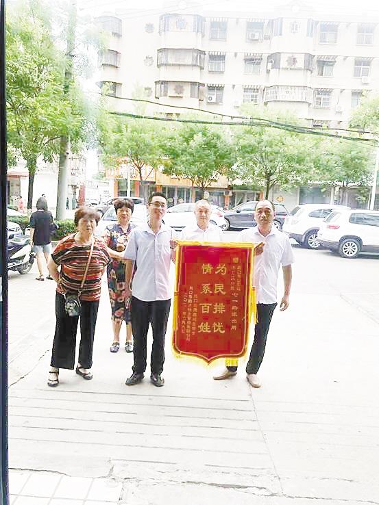 本报讯 7月6日清晨,川汇区公安分局七一路派出所门前鲜艳的五星红旗迎风飘扬,这时,几名群众手持锦旗,拉着一车矿泉水、方便面等物品来到七一路派出所,锦旗上“情系百姓、为民排忧”的烫金大字在朝阳中熠熠生辉(如图)。该所全体民警迅速集结,用最庄重的方式回应群众的深情。