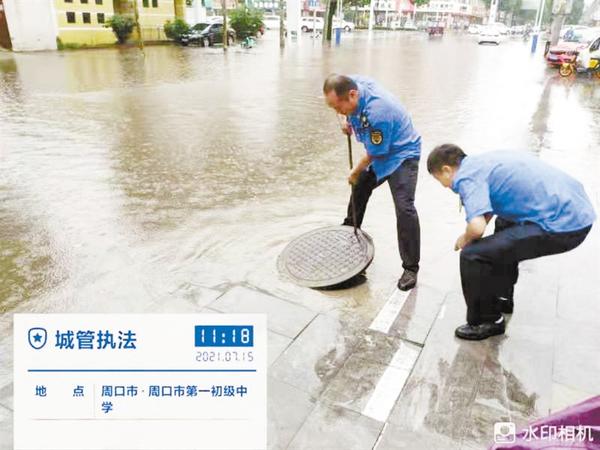 市政部门提前开启闸门,紧盯各路段、桥涵泵站,做好雨水抽排应对,同时打开道路井盖,在确保安全的前提下加速积水排出;各区、各办事处城管队员到达各自责任区域,加强道路和桥梁、涵洞巡查,排查易反涌顶开窨井盖区域,危险区域设置警示标志,安排专人值守确保安全;环卫人员清理井篦口垃圾、杂物、淤泥、断枝等,确保排水通畅;水利部门紧急开挖太昊路运粮河等部分路段沟渠围堰,加快积水排放……