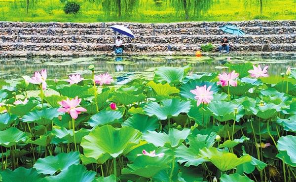 炎炎夏日,在荷塘垂钓是一件非常惬意的事情,荷花盛开,荷叶青绿,香气怡人,垂钓者撑起各色各样的遮阳伞,与盛开的荷花相映成趣,成为沙颍河岸边一道靓丽的风景线。 记者田青叶摄