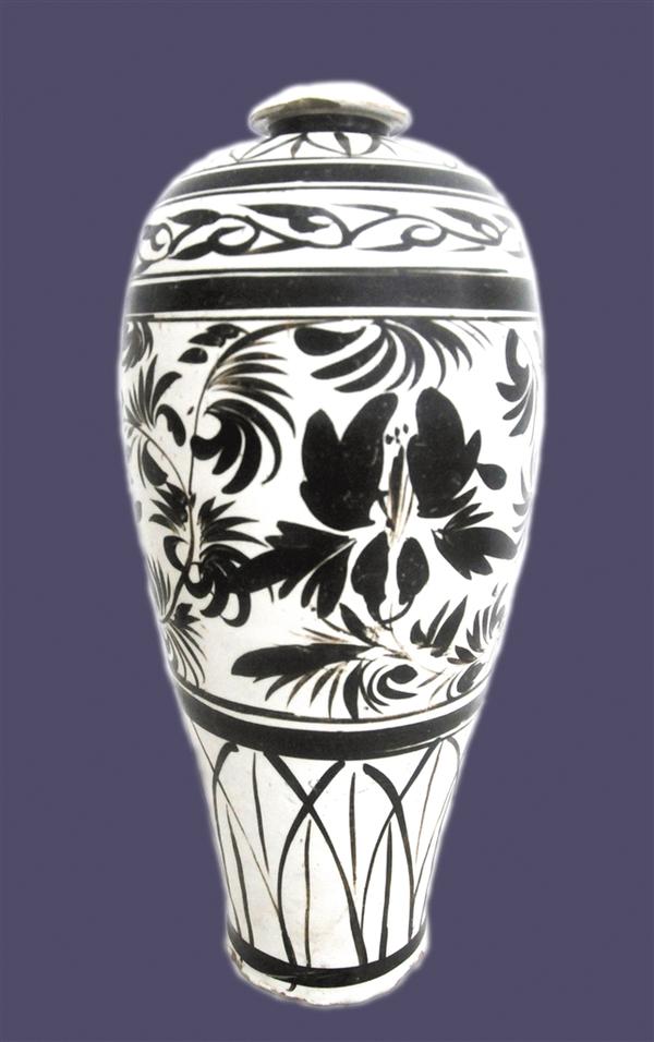 磁州窑,在今河北省磁县,因其古属磁州而得名,影响范围较广,北方各地纷纷效仿,形成了庞大繁杂的磁州窑体系,主要分布于河南、河北和山西等地,由宋、辽、金延续至元、明、清。磁州窑系以白地黑彩瓷器著称于世,做工精致巧妙,器型端庄工整,黑白对比强烈,图案鲜明醒目,简练生动,形成了磁州窑系特有的纹饰风格。磁州窑系的梅瓶,整体纹饰繁而不乱、典雅秀美,更是磁州窑系瓷器中之上品佳作,也是我国古代陶瓷艺术的名贵品种。