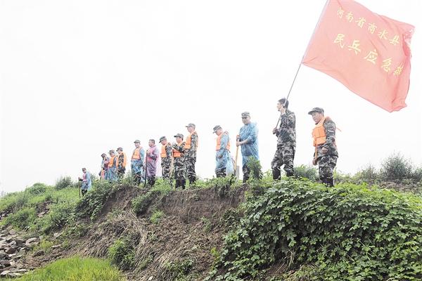 为做好抗洪抢险工作,商水县郝岗镇组织了一支30人参加的民兵应急排,加大对沙河沿岸险情排查力度,确保人民生命财产安全。图为7月21日民兵在冒雨巡查沙河险工段。③3记者 付永奇 摄