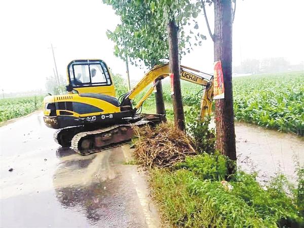 本报讯 7月20日晚,接到上级气象部门暴雨红色预警信号之后,西华县艾岗乡召集防汛应急队,全体人员紧急出动,挖掘机连夜作业疏通沟渠,排水除涝。