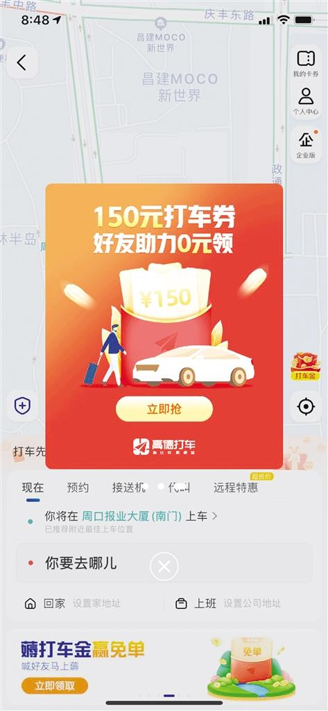 记者下载了多家网约车的APP,发现只要新人注册,平台就会赠送新人出行专享券,各平台在宣称打车“便宜”的同时,以“首单福利”“现金补贴”“好友助力”等方式“拉拢”用户。如高德打车推出150元打车券包,可19.9元购买,也可通过邀请好友助力获得。