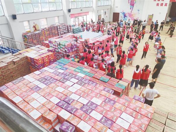 当天19时许,记者在位于扶沟县高中体育馆内的扶沟县红十字会爱心接收点看到,10辆卡车一字排开,很是壮观。志愿者们自觉排队周转物资(如图)。