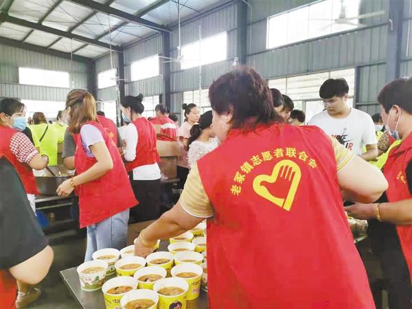 风雨无情,人间有爱。7月23日上午,老冢镇志愿者联合会近100名志愿者及爱心商户代表,在镇党委书记寇永立的带领下,前往常营镇油田小学安置点看望慰问生活在那里的扶沟、西华两地的转移安置群众,为他们送去了自己连夜制作的包子1000个、馒头2000个、熟鸡蛋2000枚,并在午餐时间开展集中志愿服务活动。志愿者与转移群众亲切交谈,详细了解他们家中受灾情况以及在安置点的生活情况,引导他们放松心情、安心居住、提振信心、共渡难关。