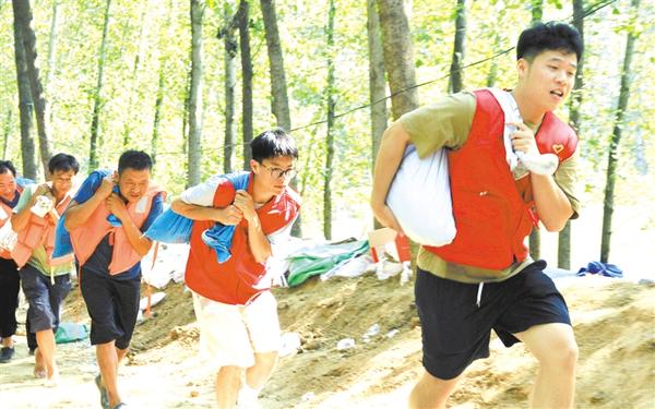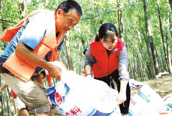 四川传媒学院2020级大学生王博硕(左二)和浙江传媒学院2019级大学生党员王奕皓(右一)加入刘王庄村党员先锋突击队,在大堤上扛运沙袋。