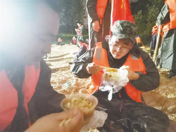 当天晚上,大雨滂沱,电闪雷鸣,史路路和其他队员迅速进入指定工段处投入战斗。他们2人一组,一人撑袋、一人铲泥沙装袋,铺设防雨布、压沙袋。机器轰鸣,雨越下越大,这些反而更加激起了大家的斗志。大家连续奋战8小时,累计填装沙袋1200余个,铺设、压实防雨布600余平方米,圆满完成了上级交办的任务,协助筑牢了贾鲁河防汛“青春堤坝”。