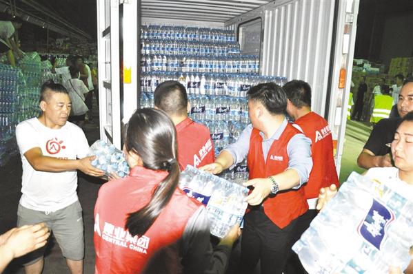 原厂房临时变成了抗洪物资接收点,偌大的仓库堆了不少物资,众多抗洪工作人员、志愿者和自发前来帮忙的市民都在紧张忙碌。这里灯火通明,人多而有序。