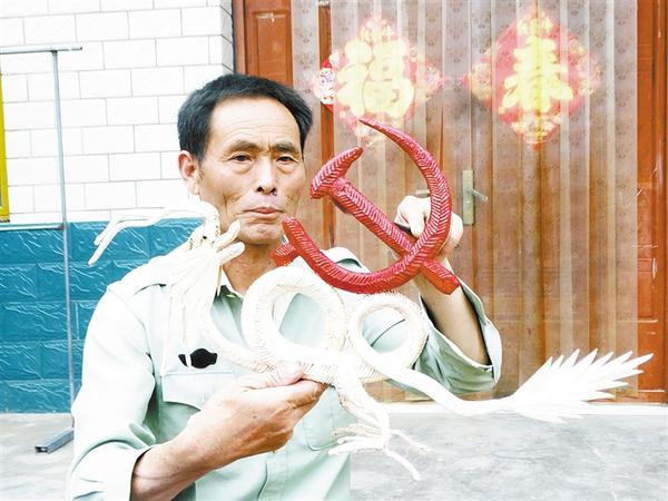 这件用棕叶编成的“中国龙”,长约100厘米,其身不仅编有“100”字样图案,正上方的位置还有镰刀锤子组成的党徽。