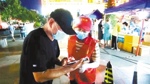 夜渐深,广场上一名70岁患有高血压的大爷不会扫健康码,拿着手机急得来回踱步。志愿者党高瞻见状急忙上前询问,了解情况后,耐心指导老人一步步用手机操作,安慰他“不要着急”,随后搀扶着他去检测点完成咽拭子采集。“今天帮助了很多不会扫码的老年人完成检测,为周口抗疫尽自己的一点力量吧。”党高瞻说。
