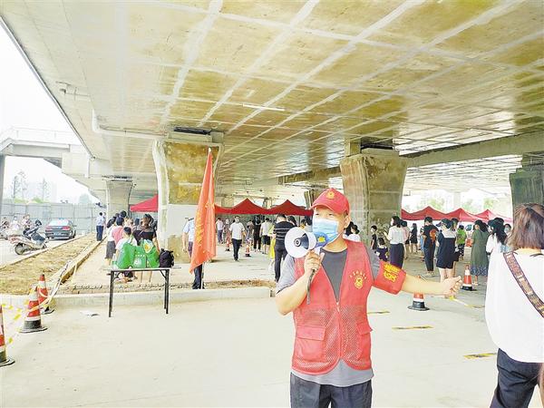 本报讯 “请大家有序排队,不要站得太近,保持一米距离……”8月11日,在中心城区建业社区核酸检测点,身穿红马甲的闫本明拿着大喇叭不时向周边的群众喊话,略显沙哑的声音在人群中传开。