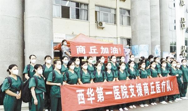 本报讯 8月16日上午,西华第一医院连夜迅速集结的30名护理精英组成医疗队出征商丘,支援商丘市全民核酸检测工作。