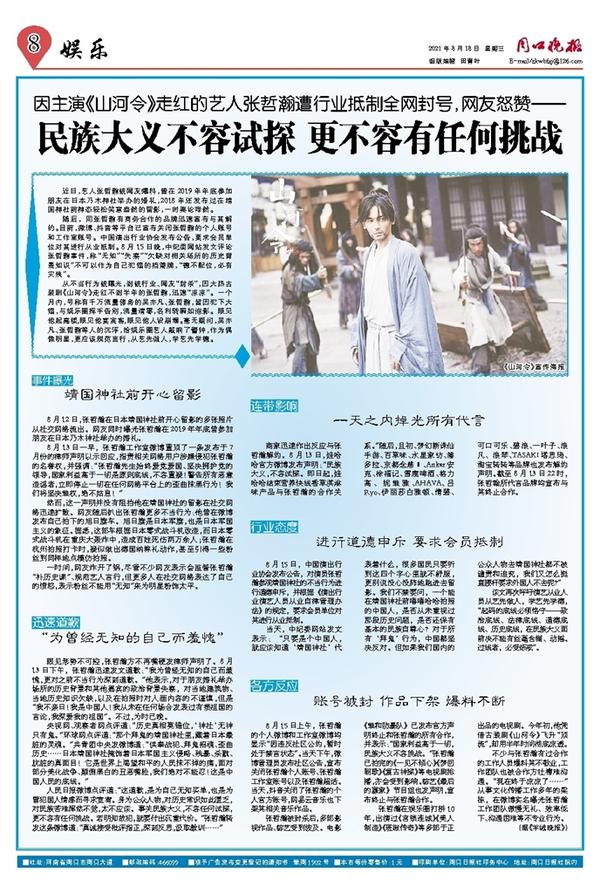 从不当行为被曝光,到被行业、网友“封杀”,因大热古装剧《山河令》走红不到半年的张哲瀚,迅速“凉凉”。一个月内,号称有千万流量傍身的吴亦凡、张哲瀚,皆因犯下大错,与娱乐圈挥手告别,流量清零,名利转瞬如泡影。眼见他起高楼,眼见他宴宾客,眼见他人设崩塌。毫无疑问,吴亦凡、张哲瀚等人的沉浮,给娱乐圈艺人敲响了警钟,作为偶像明星,更应该规范言行,从艺先做人,学艺先学德。