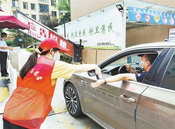 8月18日,建业社区入口处,志愿者在为出入居民测体温。