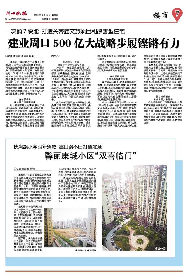 本报讯 “建业地产一次摘下7块地,周口关帝庙文旅项目真要启动了,同时建业地产还要在目前的建业世和府二期东侧启动三期项目,建改善型住宅。”8月18日中午,随着周口市网拍(2021)10号成交公示在网上发布,建业集团周口城市公司成功摘得ZK2021-(57-60)、ZK2021-(62-64)两宗优质地块的消息不径而走,迅速传遍沙颍河两岸。此次拍卖活动圆满成功也标志着建业周口十年500亿大战略迈出坚实步伐,步履铿锵有力。