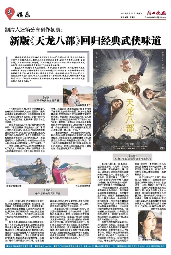 《天龙八部》此前已多次被影视化。其中,1997年黄日华、陈浩民领衔的版本堪称经典,至今在豆瓣保持着9.0分的好口碑;2003年由胡军、林志颖等演绎的版本同样可圈可点,在当年掀起一波武侠收视热。珠玉在前,新版《天龙八部》的主创们要如何突破?近日,制片人汪笛接受了记者的采访,他表示,新版剧集的关键词是“回归”:“希望能回到观众曾经熟悉和欣赏的经典武侠味道,而不是用大量的技术手段去包装。”