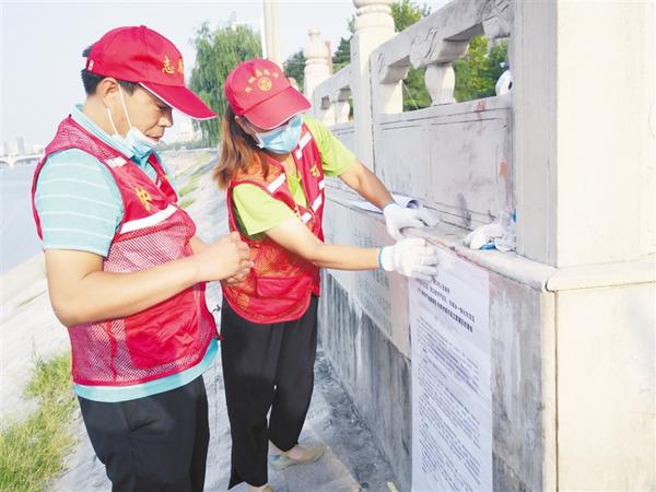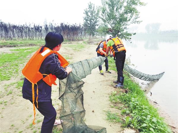 8月28日,周口市慈孝文化促进会组织30多名民间河长,沿沙颍河河堤张贴市政府禁渔令,民间河长沿途发现河内捕鱼的地笼,也一律收缴。