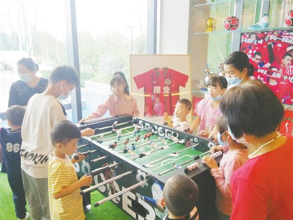 和传统的营销中心布局不同,江山汇营销中心的一楼看不出一丝卖房的氛围,反而像是一片建业企业文化展览馆,足球文化展示区、电影小镇展示区、教育展示区……每一寸色彩、每一个摆件都代表着建业集团各业务板块的文化内涵。