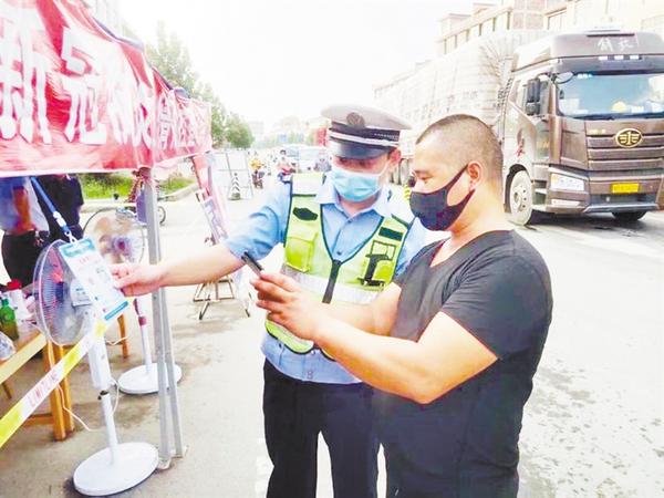 “你好,请戴好口罩,出示健康码、行程码……”近日,在郸城县G344国道闫楼疫情防控卡点,郸城县公安局交警大队公路巡逻中队民警陈光正在对过往车辆和人员进行查验登记(如图)。