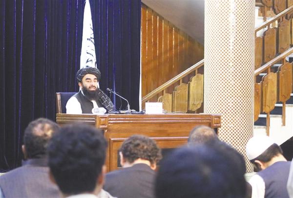 当地时间9月6日,阿富汗塔利班发言人扎比乌拉·穆贾希德在喀布尔举行记者会。