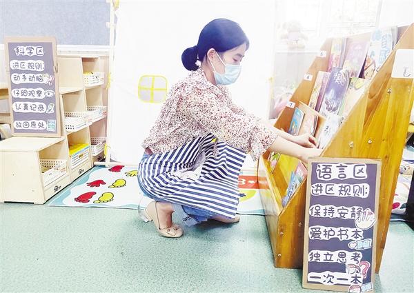 市直幼儿园的一名老师在整理教室的图书。为迎接新学期的到来,做到平安开学、开学平安,让即将入园的孩子们开启健康愉快的幼儿园生活,日前,市直幼儿园开展了卫生大清洁活动。