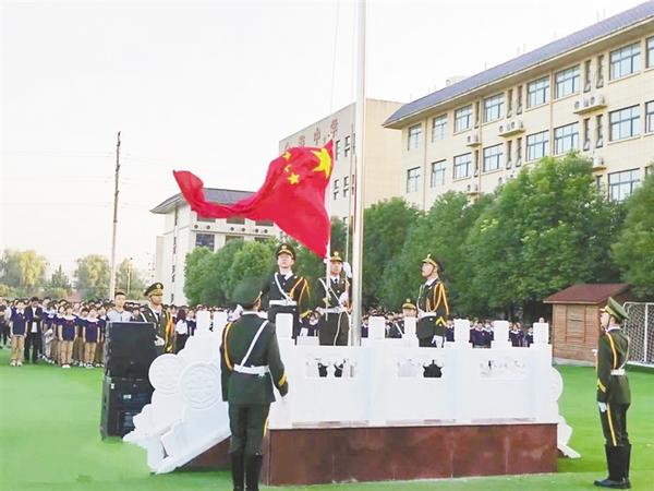 当日上午,在全体师生的注目下,国旗护卫队成员踏着整齐划一的步伐走向旗台,伴随着雄壮激昂的旋律,五星红旗冉冉升起,在旭日中迎风飘扬。“我们生在红旗下,长在春风里,目光所至皆为华夏,五星闪耀皆为信仰。作为成长在新时代的我们,不能遗忘历史,应该铭记历史,发奋努力。”升旗仪式上,学生仝浩洋说。