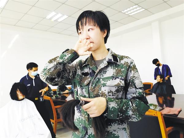 今年20岁的吴婷婷是信阳师范学院大二学生。微信朋友圈的生活照里,她是一位留着齐肩发、有着可爱笑容的“萌妹子”。当理发师帮她剪下秀发时,看着镜中的“假小子”,她笑着笑着就哭了。如今的训练场上,一头齐耳短发、身穿体能服的她,正努力成长为一名英姿飒爽的女兵。