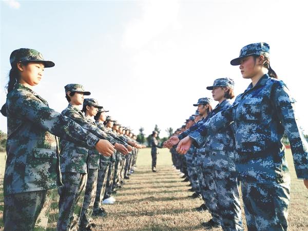 “这个动作,上体一定要保持正直,靠腿要迅速有力。”训练场上,教官认真负责,姑娘们一丝不苟,经受阵阵热浪“烤”验。虽然个个挥汗如雨,但她们仍用心完成教官指定的每个动作,以崭新的面貌、昂扬的姿态接受役前训练。