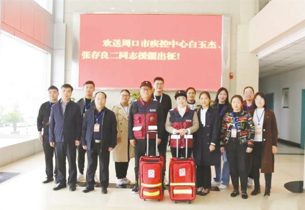 本报讯 10月9日,周口市疾控中心举行欢送白玉洁、张存良两位队员援疆出征仪式(如图)。