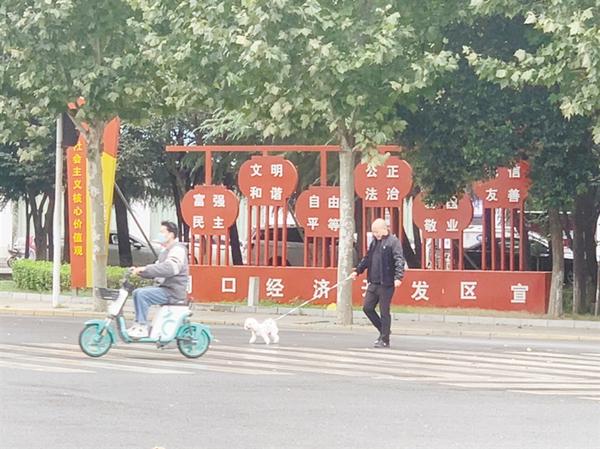 牵紧“文明绳”,做文明养犬人,创建人犬和谐的文明城市。10月10日14时许,在中心城区中州大道与莲花路交叉口,一名男子外出遛狗时,给宠物狗拴上了牵引绳。②13 记者 王慕晨 摄
