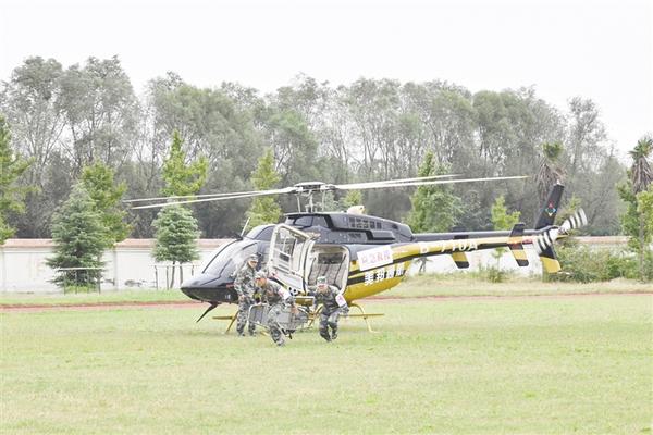 随着空中传来直升机螺旋桨的声音,救援直升机在现场盘旋,侦察情况后平稳降落。西华县民兵救援分队队员迅速下机,携带担架和医疗箱,匍匐前进至伤员身边进行紧急包扎和救治,并将伤员通过直升机送至医院,完成救援任务。