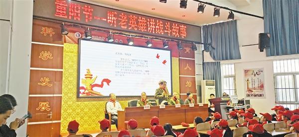 本报讯 金秋十月爽,九九话重阳。10月13日,周口报业小记者中心联手文昌小学开展“听参战老英雄讲战斗故事”活动(如图), 师生们与老英雄亲切交流,感悟幸福生活,共迎重阳节。
