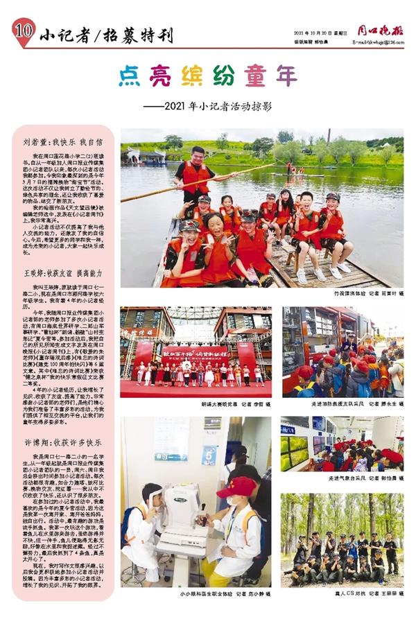 我是周口七一路二小的一名学生,从一年级起就是周口报业传媒集团小记者团队的一员,周六、周日我总会挤出时间参加小记者活动。每次活动都很有趣,如合力建塔、拔河比赛、换物交友、挖红薯……我从中不仅收获了快乐,还认识了很多朋友。
