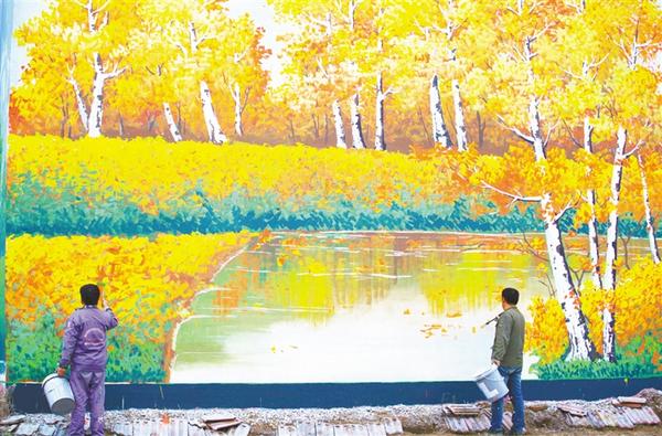 10月25日,在商水县城关乡大刘村,工作人员用手中的画笔描绘着新农村新生活。