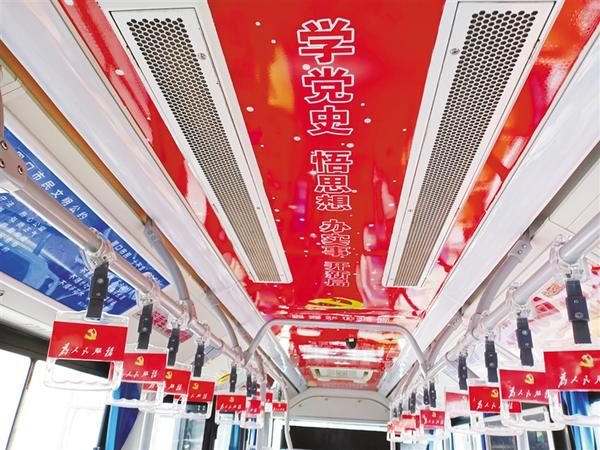 10月25日,记者在周口市公交总公司院内看到,一辆车头前印有“红色主题班线”标识的公交车格外引人注目,虽然该车的外形与其他公交车差别不大,但车厢内贴满了红色标语口号,扶手、座椅及车顶上都贴有“为人民服务”“学党史、悟思想、办实事、开新局”“革命小故事”等宣传内容,给人耳目一新的感觉。③2