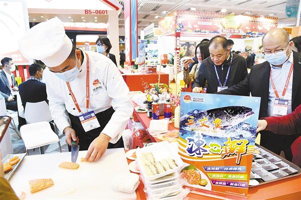 10月28日,一家参展商在渔博会上现场制作三文鱼食品。