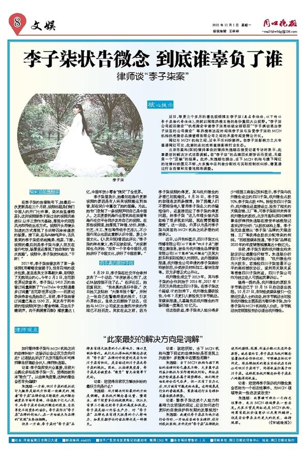 北京市盈科(深圳)律师事务所律师朱逸聪在接受记者专访时表示,此事最好的解决方式还是调解。若“李子柒”的品牌因长期涉诉而受损,无疑是一个“双输”的结果。此外,朱逸聪也提出,当下MCN机构与旗下网红的法律纠纷屡见不鲜,大多集中在利益分配权与实际控制权纠纷,需要通过行业自律和完善法规来调整。