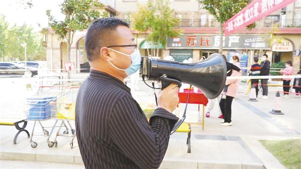 11月13日,一名小区志愿者手持小喇叭宣传疫情防控常识。当日,记者在扶沟县商务中心区的领秀新城小区志愿服务卡点看到,第8轮全民核酸检测正在有序进行。在“爱心小喇叭”的通知下,各单元楼层居民佩戴好口罩错峰下楼,保持“一米线”、文明核酸检测。身穿防护服的医护工作人员和中心区志愿者工作高效、配合密切,现场忙而不乱、气氛温馨。②19记者 金月全 摄