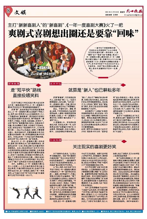 正是优秀喜剧人共同创作的这些关注当下时代议题的优秀作品,令观众开怀大笑,让人从中感受到共鸣、发泄和治愈,因而获得最大程度的出圈,成为《一年一度喜剧大赛》的收视密码。(据《羊城晚报》)