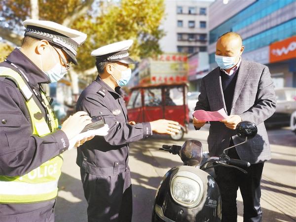 11月18日8时许,在中心城区七一路与中州大道交叉口附近,市公安局交通管理支队一大队民辅警向过往群众发放推进电动自行车、电摩上牌的宣传彩页。据悉,下月15日起,我市公安交管部门将严查电摩无证驾驶、无牌上路、不按要求佩戴安全头盔等行为,没有牌照的电动自行车将被禁止上路。记者 姬慧洋 摄