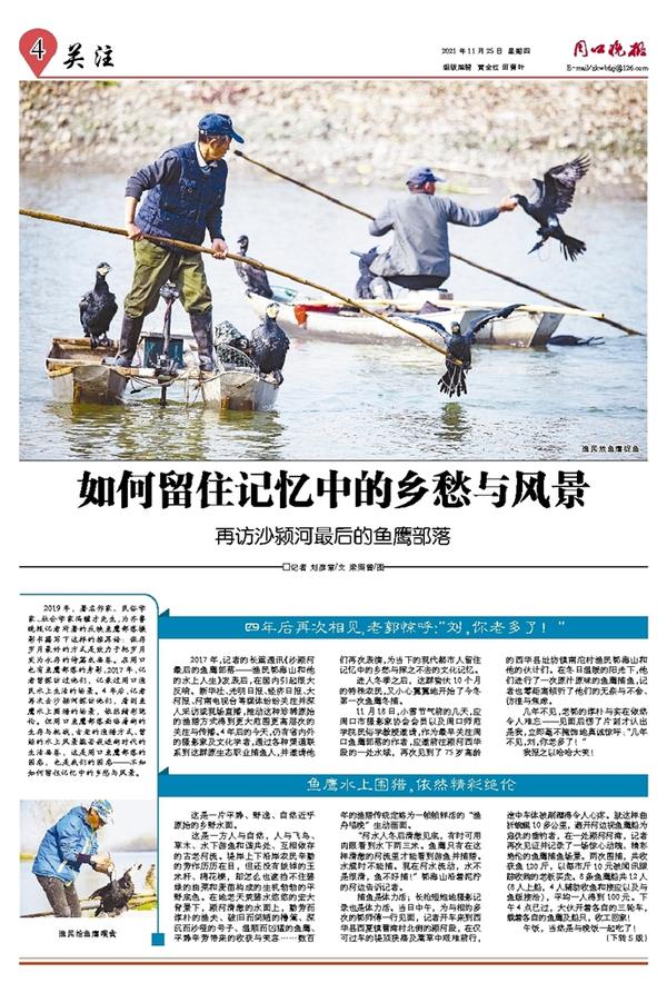 2019年,著名作家、民俗学家、社会学家冯骥才先生,为齐鲁晚报记者所著的反映鱼鹰部落摄影书籍写下这样的推荐语:保存岁月最好的方式是致力于把岁月变为永存的诗篇或画卷。在周口也有鱼鹰部落的身影,2017年,记者曾探访过他们,记录过周口渔民水上生活的场景。4年后,记者再次去沙颍河探访他们,看到鱼鹰水上围猎的场景,依然精彩绝伦。但周口鱼鹰部落面临着新的生存与挑战,古老的渔猎方式、曾经的水上风景能否嵌进新时代的生活画卷,这是周口鱼鹰部落的困惑,也是我们的困惑——不知如何留住记忆中的乡愁与风景。