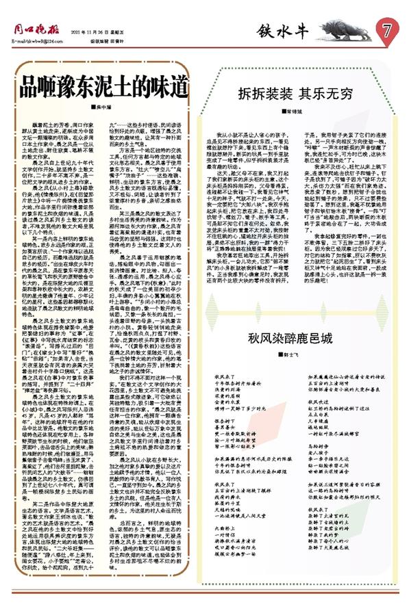 总而言之,鲜明的地域特色,浓郁的乡土气息,原生态的语言,独特的诗意韵味,无疑是对晨之风乡土散文创作的恰当评价,读他的散文可以品咂豫东泥土和炊烟的味道,也能体会到乡村生活那咀不尽嚼不烂的韵味。