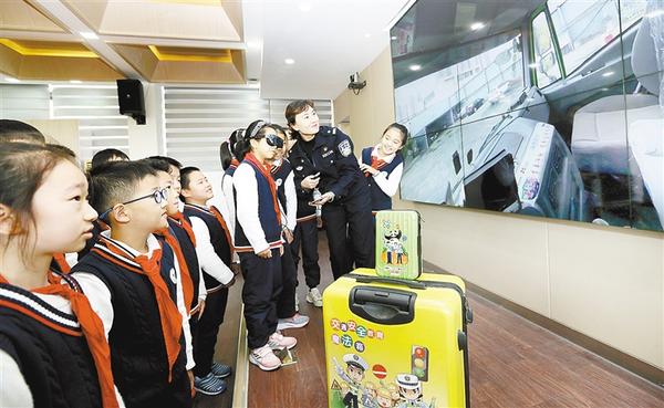 12月1日,上海市公安局徐汇分局交警支队民警张晓晨在徐汇区逸夫小学指导小学生通过VR设备体验“大货车盲区”。
