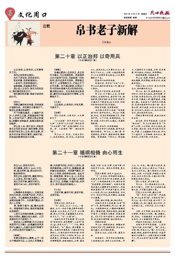 此段经文,帛书甲本全部残毁,乙本残缺之处,由河上公本补缺。河上公:无,不也。谓人君不正其身,其无国也。奇,诈也。人君不正,下虽正,复化上为诈也。善人皆复化上为妖 祥也。王弼:以正治国,则便复以奇用兵矣,故曰正复为奇。立善以和万物,則便复有妖之患也。