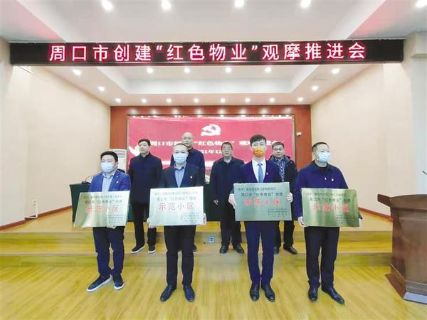 在中共周口市物业行业委员会成立大会上,市委组织部、市住建局、市民政局共同为建业物业周口世和府小区、四海同村物业佳利名门小区、鼎兴物业周口大兴第一城小区、鹏达物业周口中汇花园小区首批试点“红色物业”示范小区项目授牌。河南建业物业周口分公司代表试点“红色物业”示范小区项目作了发言。